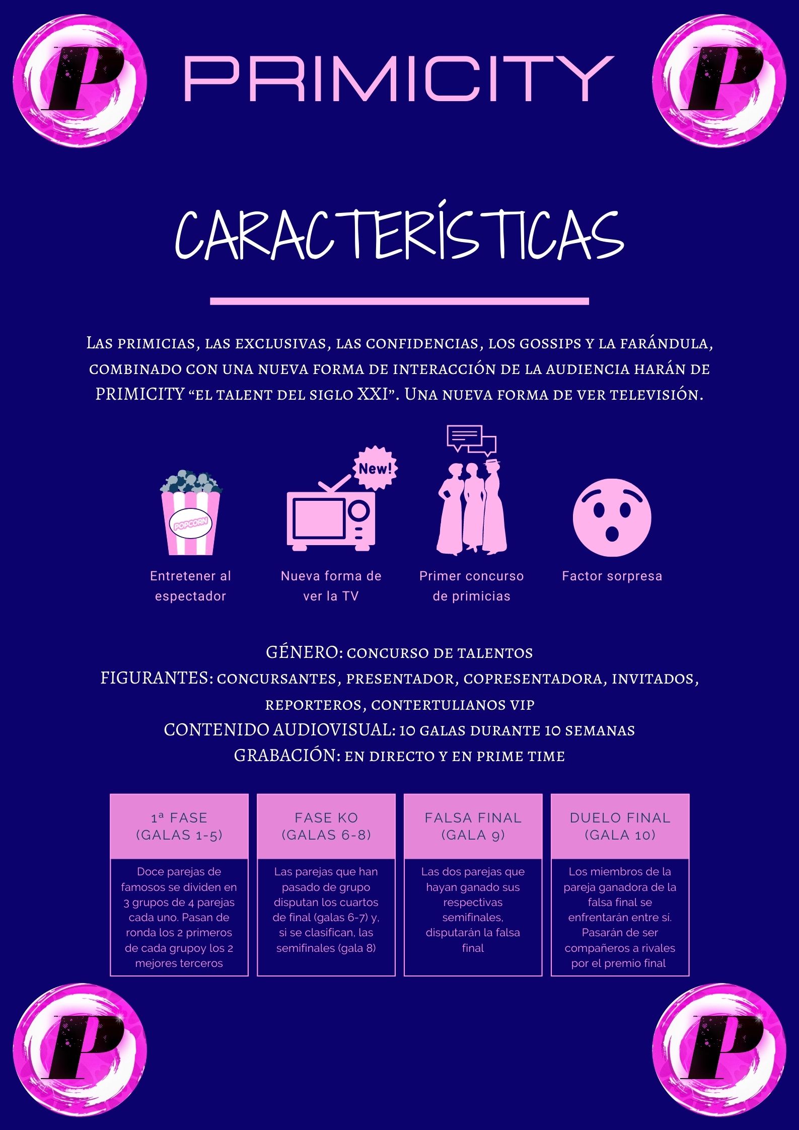 En una era en la que el mundo de la prensa rosa y la vida pública de los famosos está en auge, es de importante necesidad un talent show que lo ponga a prueba. PRIMICITY es un proyecto ambicioso, renovador y, sobre todo, realista. Para definirlo mejor, es "el concurso del siglo XXI". PRIMICITY es el contenedor perfecto de las exclusivas, las confidencias, las primicias, el gossip y la farándula.